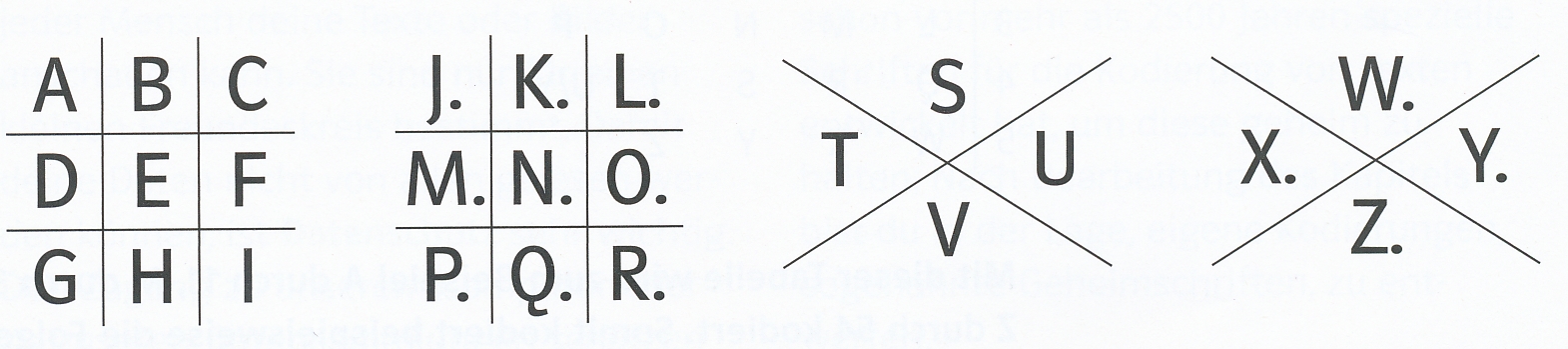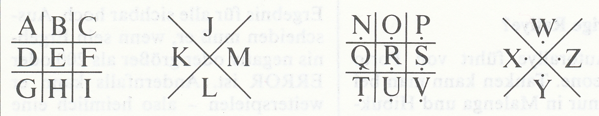 Das System der Zuordnung der Buchstaben und Symbole konnte variiert werden. Man wechselte nur die Gittertabellen, was man sich leicht merken konnte und nicht aufschreiben musste. Ein Beispiel einer anderen Zuordnung sieht man hier: