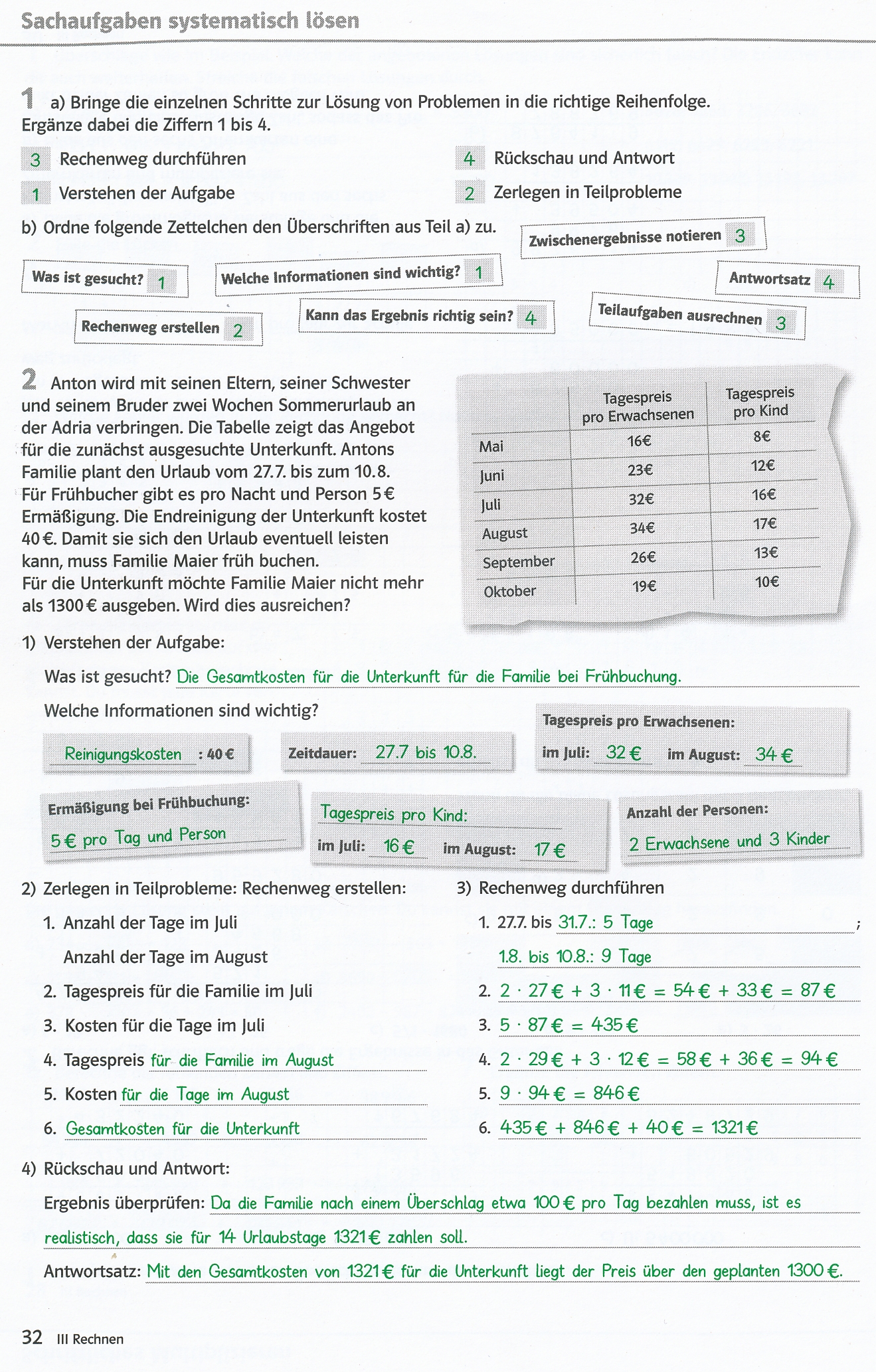 Kontrolle der Hausaufgaben im Arbeitsheft auf den Seiten 32 und 33: