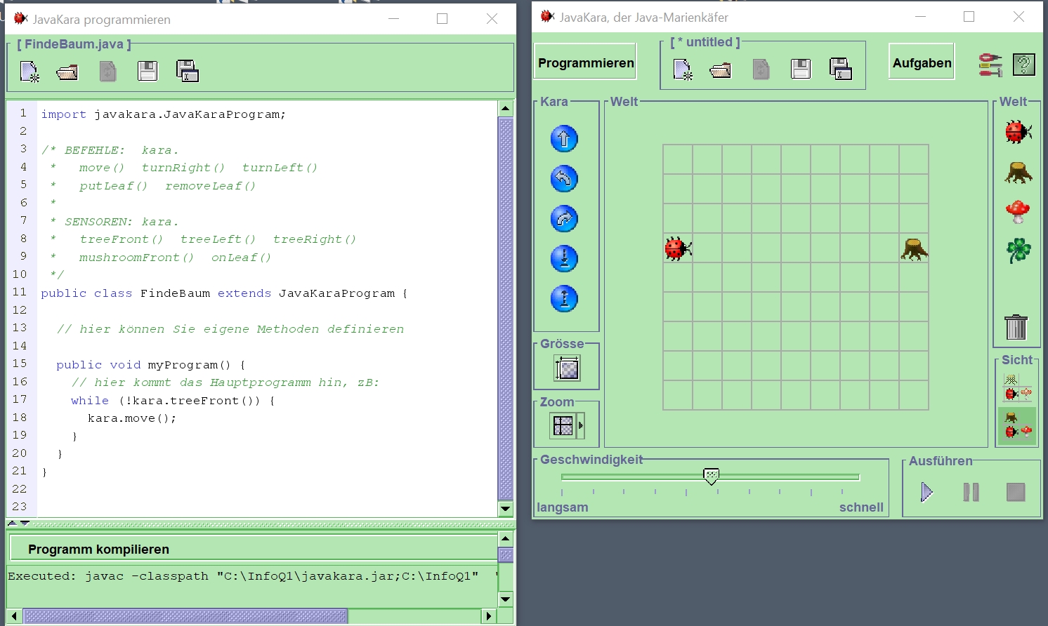 Nimm das Beispielprogramm FindeBaum als Vorlage, nenne die Klasse jetzt FindeBaum2, speichere es ab als FindeBaum2.java und ergänze das Programm so, dass Kara den Weg zurück läuft und wieder seine Startposition einnimmt. Tipp: Man darf in Kara-Programmen auch Variablen benutzen!