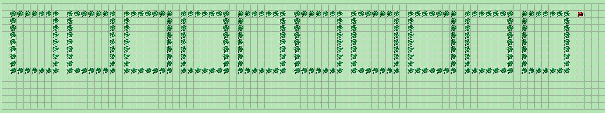 Kara soll nun mit einer Schleife zehn rechteckige Rahmen nebeneinander zeichnen. Stelle vorher die Welt auf eine Breite von 100 und eine Höhe von 15 ein. Und so soll das am Ende aussehen: Schreibe nur das Hauptprogramm mit der Schleife und den Aufrufen der Methoden hier in das Formular.