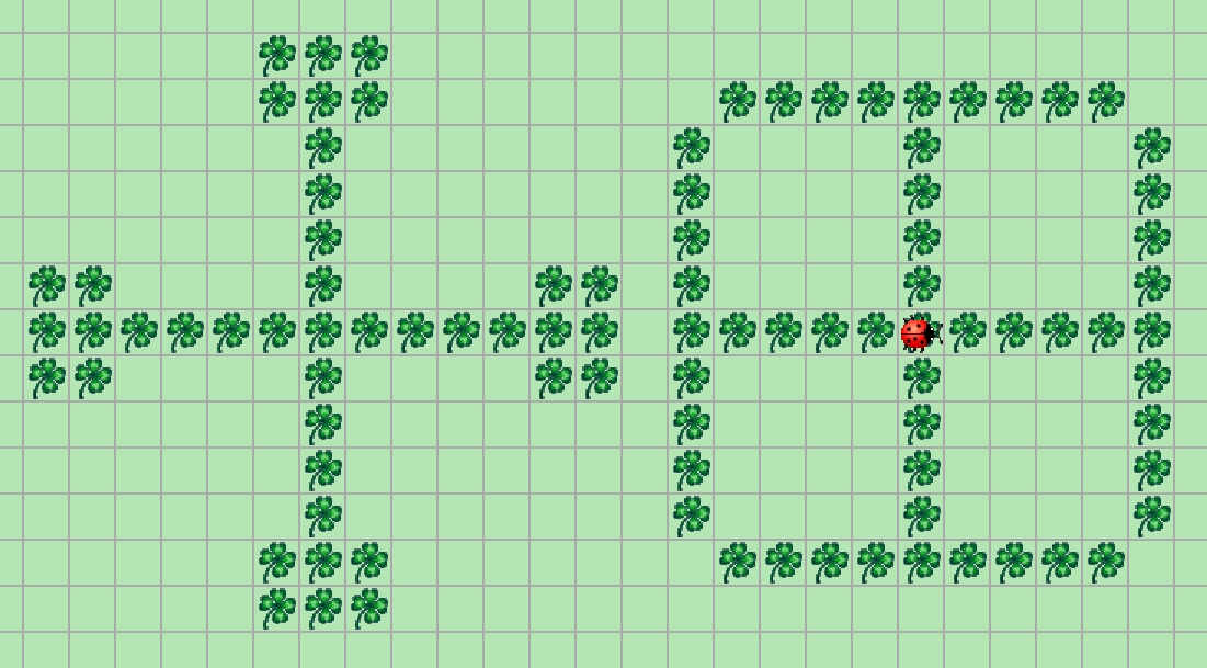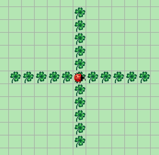 kara.putLeaf(); # Blatt in die Mitte legen. for i in range(4): # Das Folgende (eingerueckt) vier Mal machen. kara.move() # Zuerst vom Blatt in der Mitte runter. lege(5) # Einen Arm des Kreuzes legen. turnAround() # Umdrehen. gehe(6) # Zurueck bis zur Mitte kara.turnRight() # und nach rechts drehen.