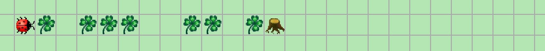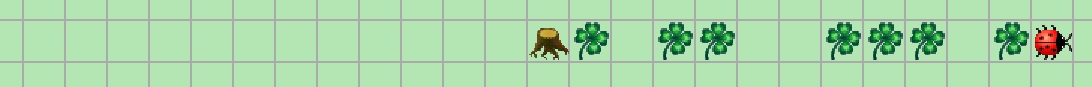 Kara steht in einer Reihe, an deren Ende ein Baum steht. Kara soll bis zum Baum laufen, dabei alle Blätter einsammeln und die Blätter hinter dem Baum spiegelbildlich ablegen. Es gibt keine weiteren Bäume, die stören könnten. Gib das komplette Programm hier ein. Hinweis: Der Unterschied zum oberen Programm liegt eigentlich nur am Verhalten direkt am Baum.