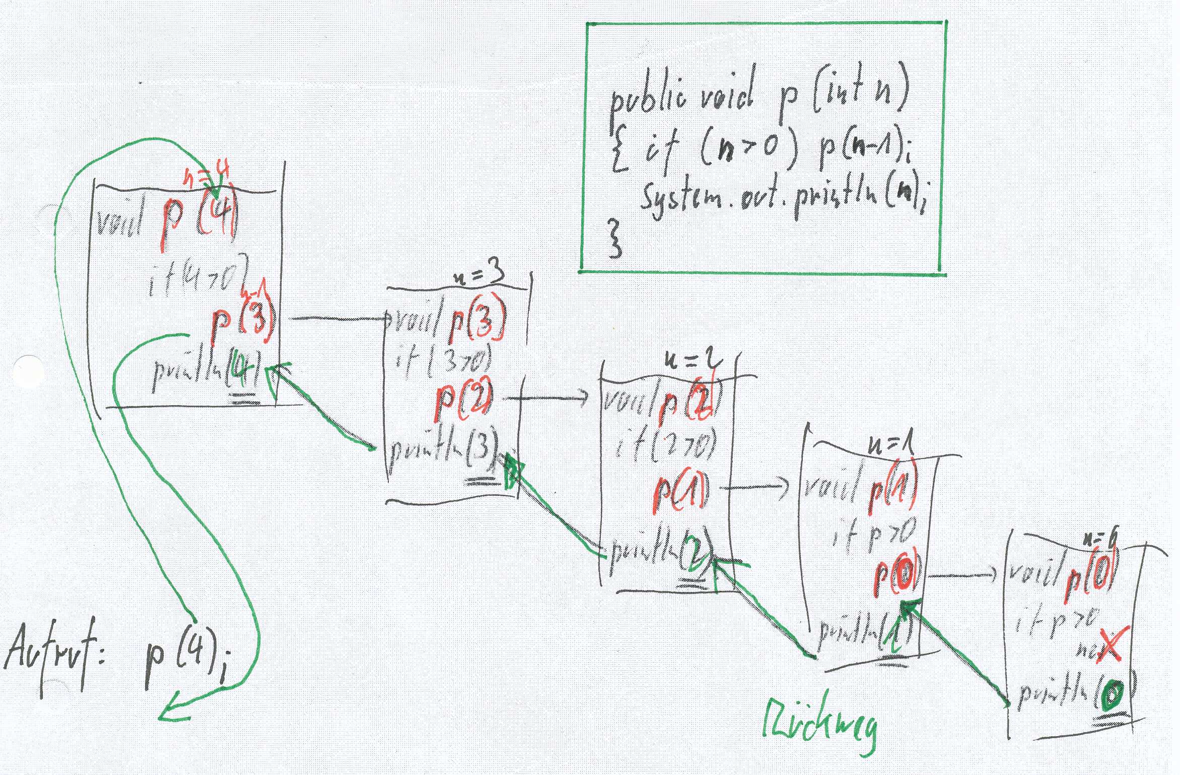 Erklärung: Durch den Aufruf p(4) startet eine Methode mit n=4. Diese Methode führt zum Aufruf p(3), wodurch die gleiche Methode (nicht die selbe!) nun mit n=3 startet. Man kann sich die gleiche Methode mehrmals aufgerufen im Computerspeicher vorstellen, wobei jede Methode ihren eigenen Wert von n hat. Dieser Aufrufmechanismus geht bis zu p(0). Nun erfolgt kein weiterer Aufruf und die Zeile mit ...println(n) wird ausgeführt, was jetzt zur Ausgabe von 0 führt. Dann kommt die Zeile mit ...println(n) des vorhergehenden Aufrufs dran, was zur Ausgabe von 1 führt. So wird der Rückweg (Rekursion) eingeschlagen.